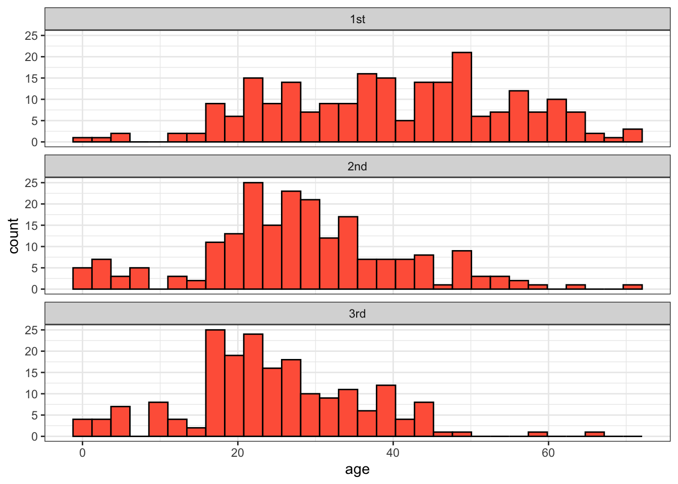 This formula tells R to “fit” a model in which the ages of passengers are grouped by the variable passenger_class.