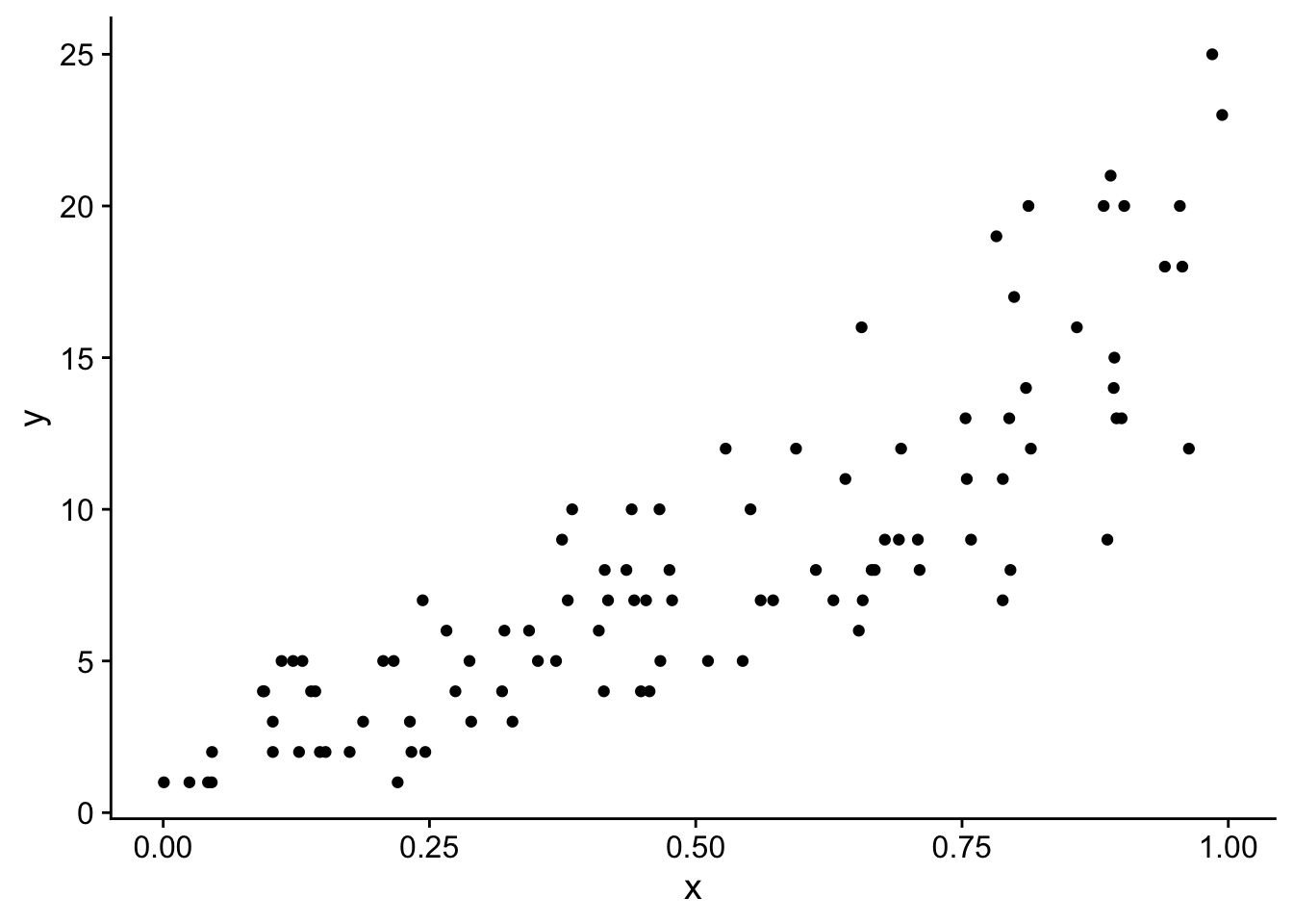 Let’s start with a Poisson GLM and a made-up dataset to go along with it. Our data will just be y (the response variable) and x (the explanatory variable). We will assume y is the count of something (e.g. species abundance) and x is some kind of continuous numerical variable like temperature or rainfall, etc.