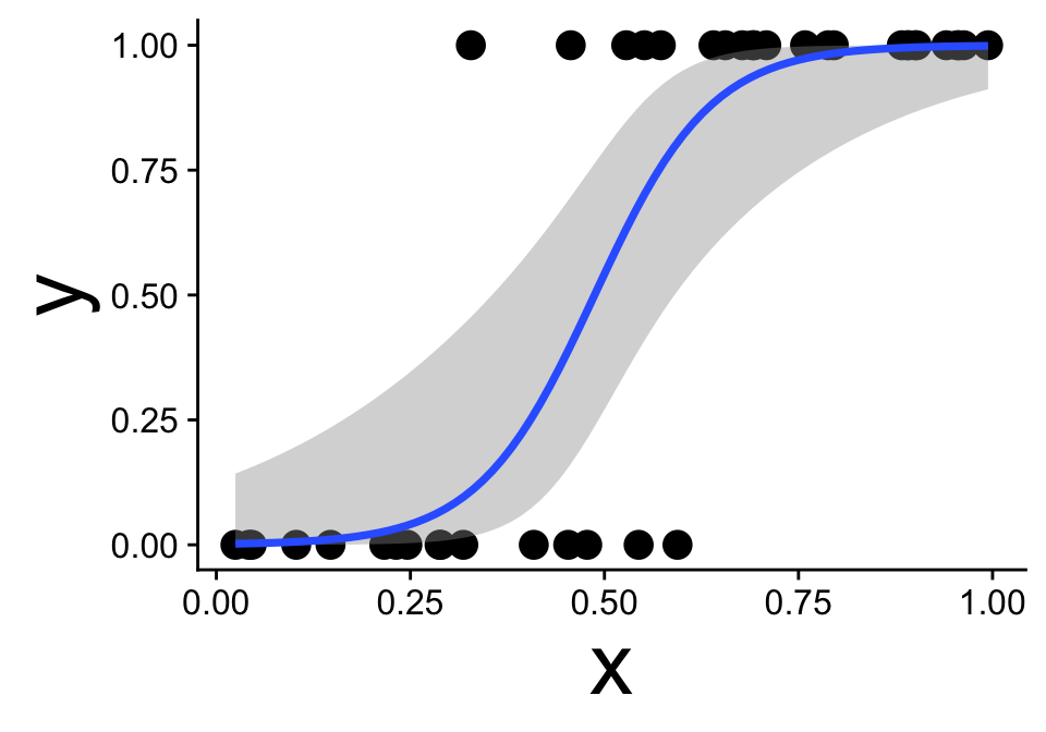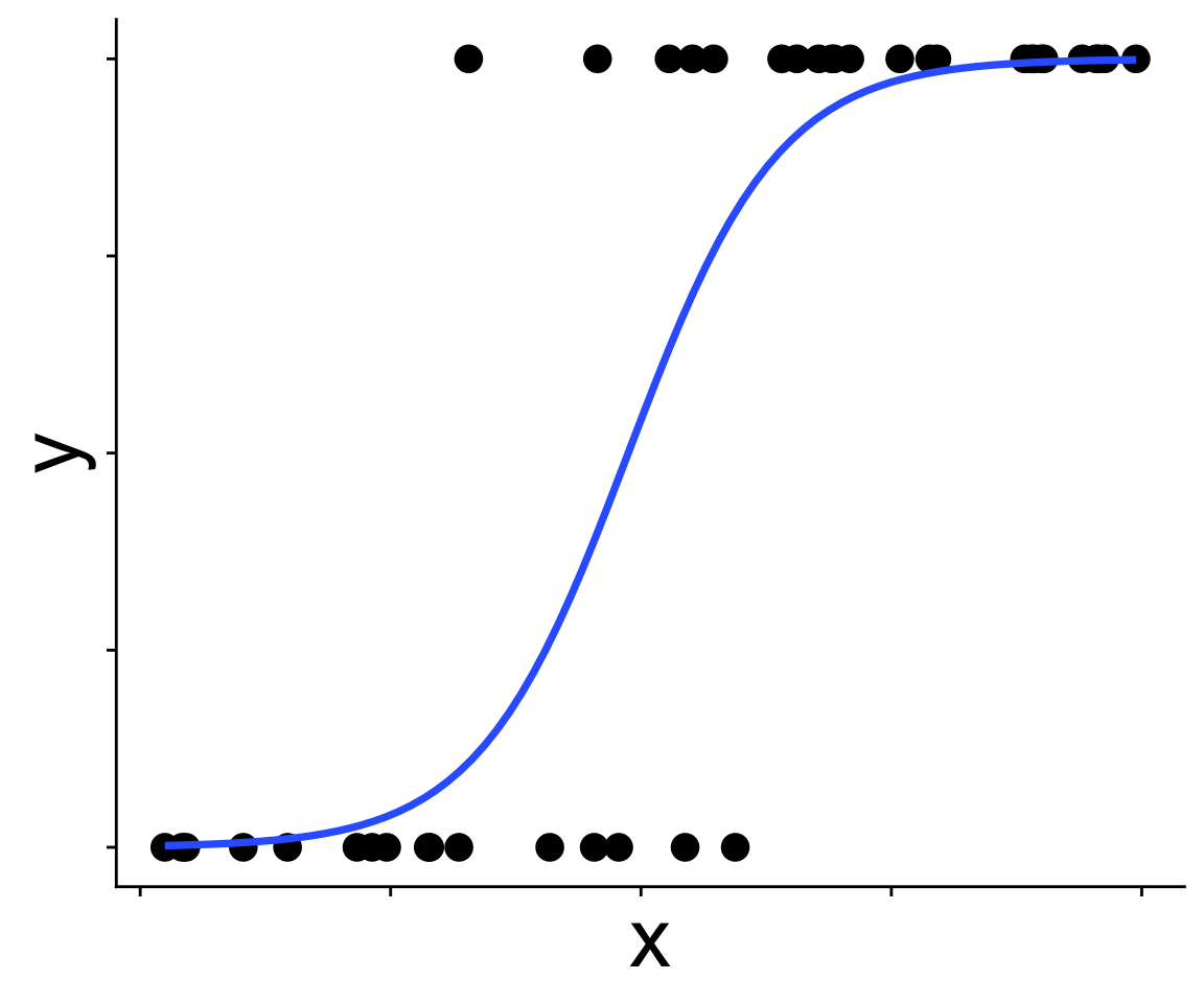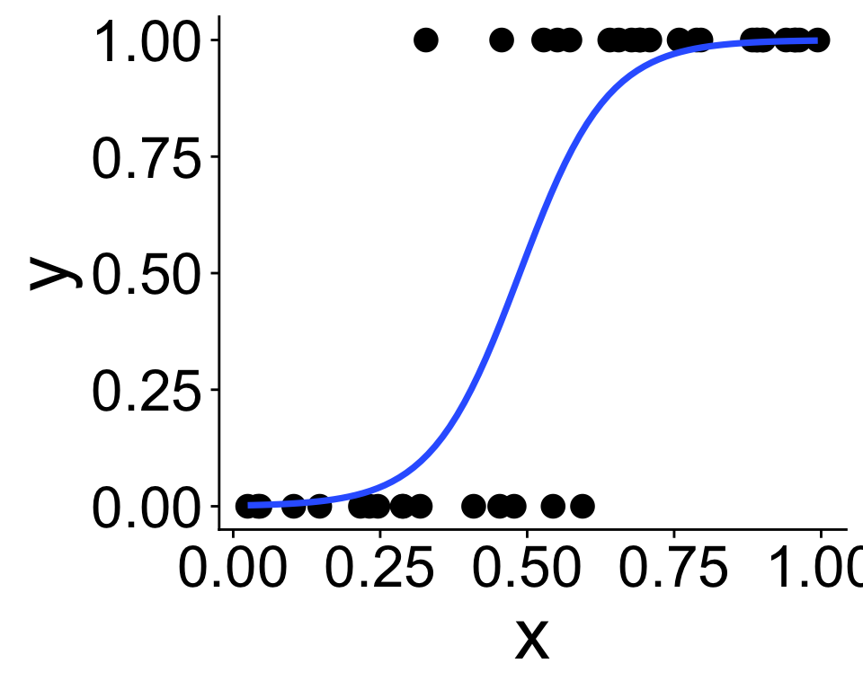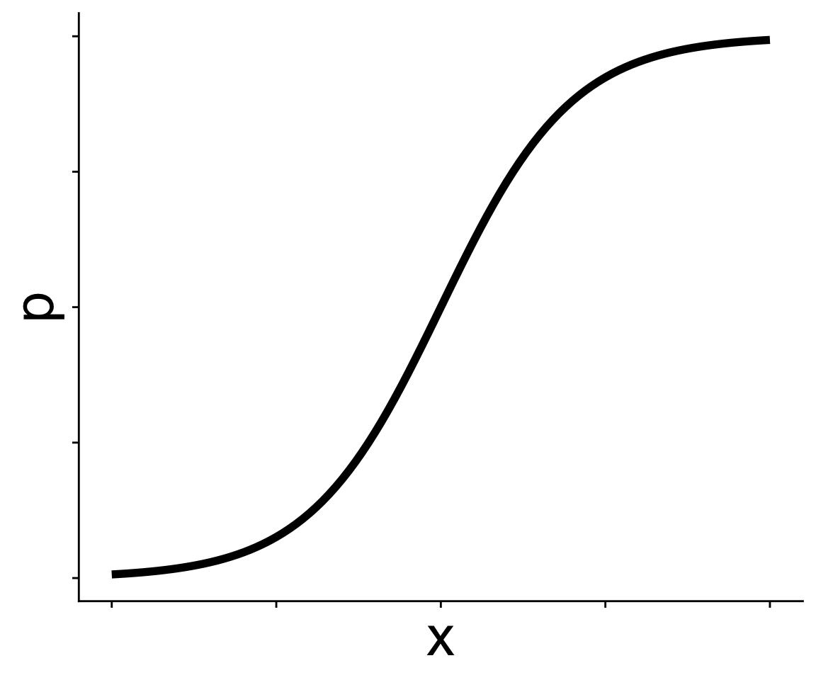 \[ p = \frac{1}{1 + e^{-(b_0 + b_1 x)}} \]