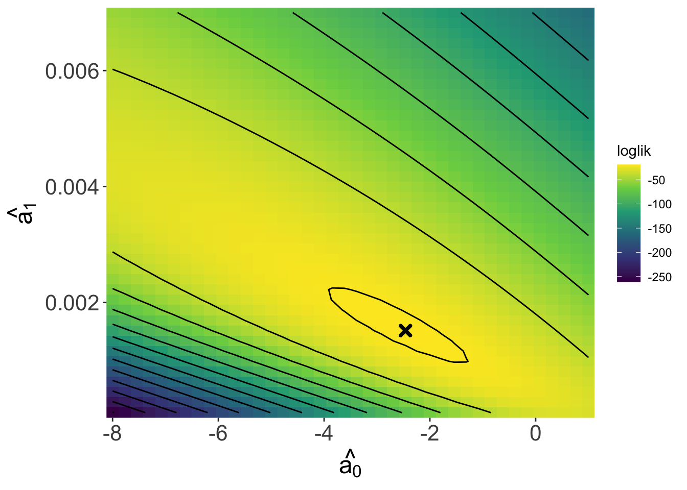 The contour lines can be read like a topo map. We can see a peak—the maximum—in this surface (marked by the x) and the coefficient values at that peak are roughly \(\hat{a_0}\) = -2.46 and \(\hat{a_1}\) = 0.0015, which are quite close to the true values of \(a_0 = -2\) and \(a_1 = 0.001\)!