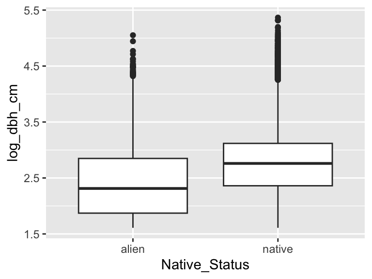 The data show the opposite pattern from our prediction. Interesting! But ultimately no matter, we have successfully identified the variables we need for our model: Native_Status and log_dbh_cm.