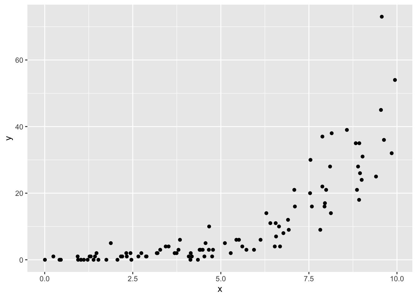 y <- rnbinom(length(x), mu = mu, size = 8)