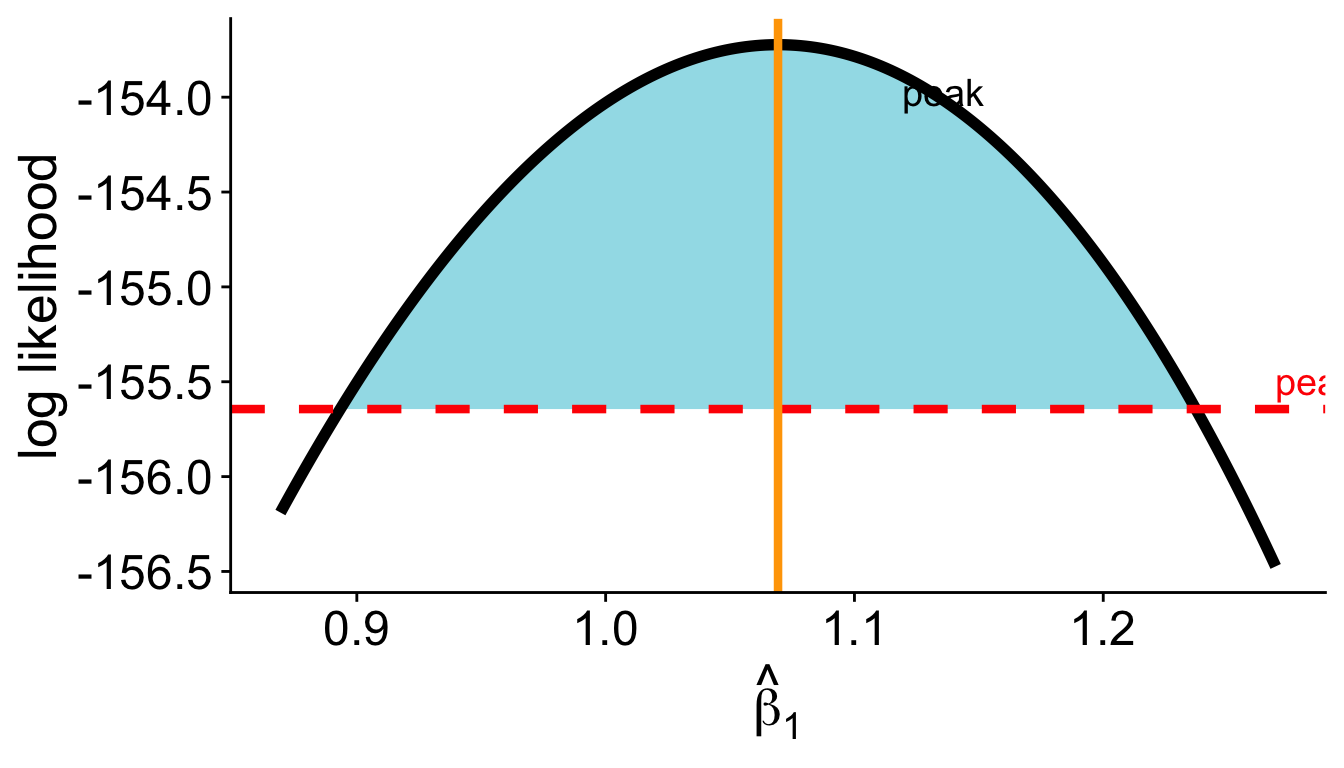 - LRT confidence intervals invert the LRT: all \(\theta\) within 1.92 log likelihood units of the peak form the 95% CI