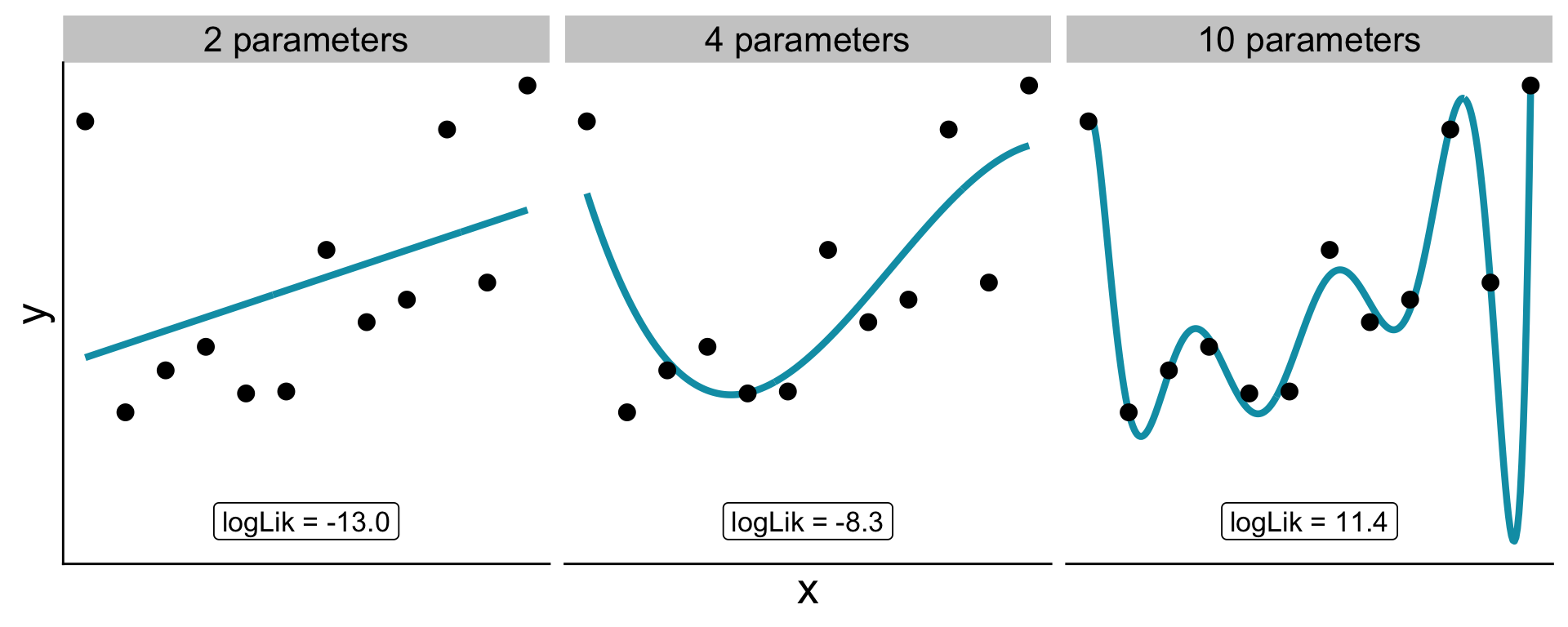 Need to consider: more parameters let the model bend to match idiosyncrasies of the data, even pure noise (the case here)