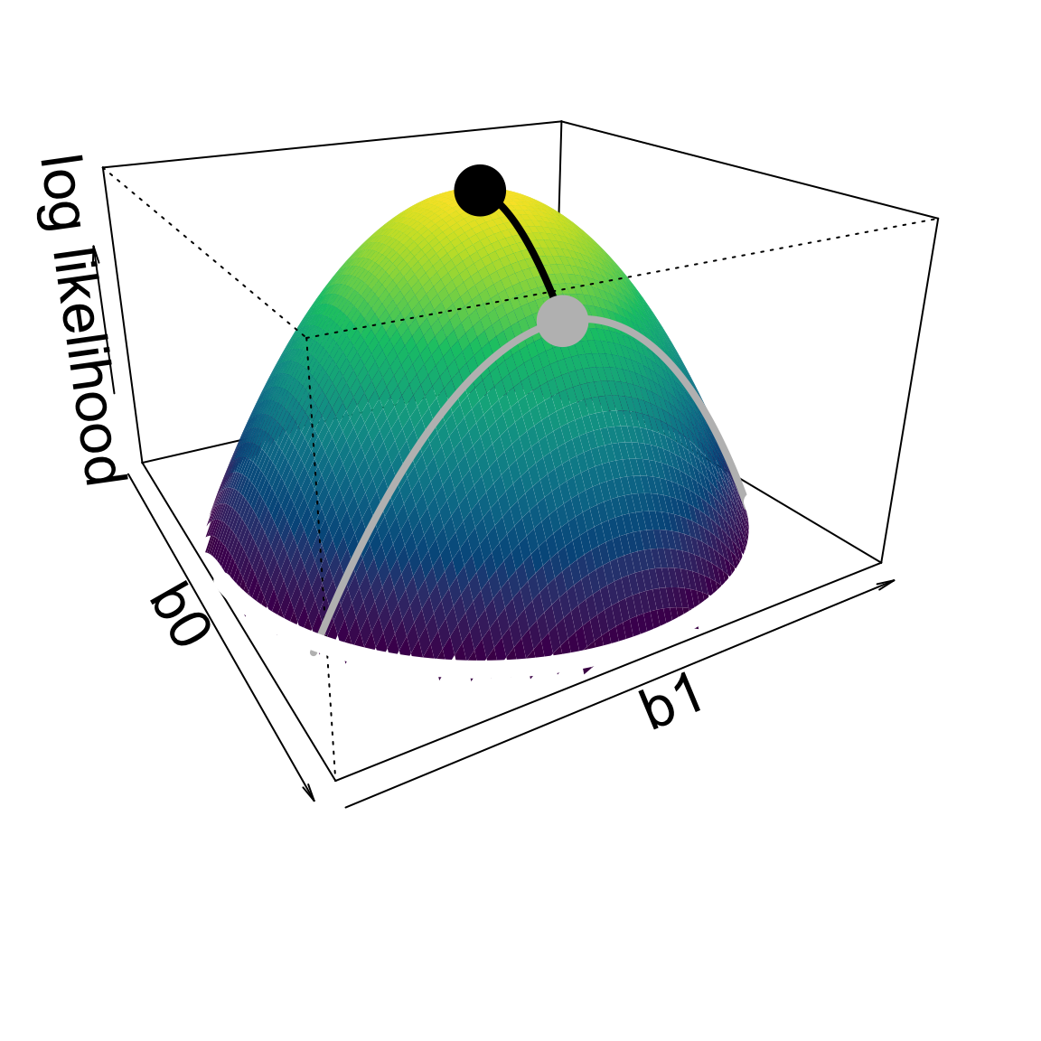 \(2(\log\mathscr{L}(\text{data} \mid b_0,~b_1) - \log\mathscr{L}(\text{data} \mid b_0)) \sim \chi^2\)