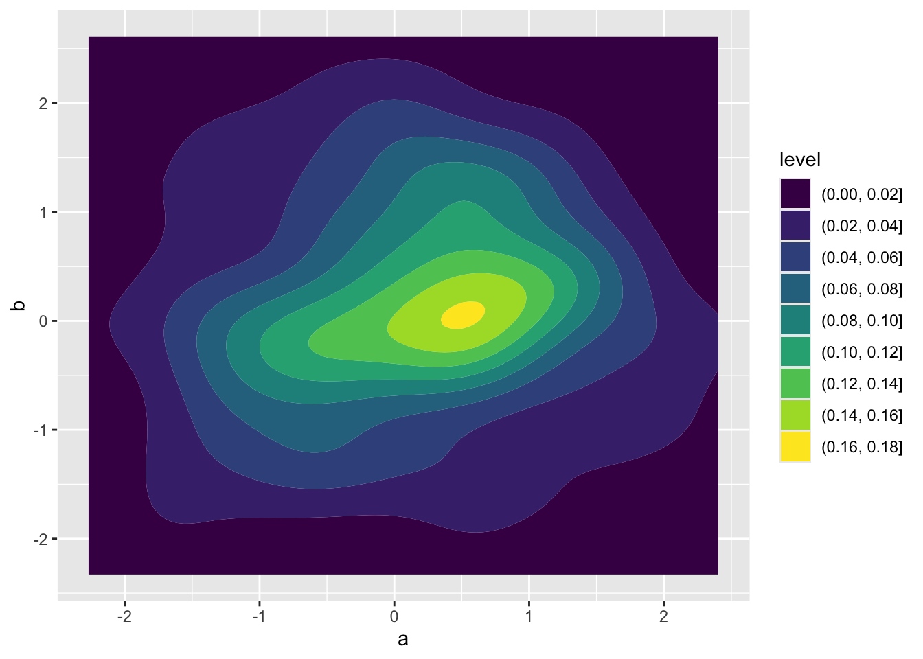 To visualize a joint distribution we can use geom_density_2d_filled. Here’s how that works