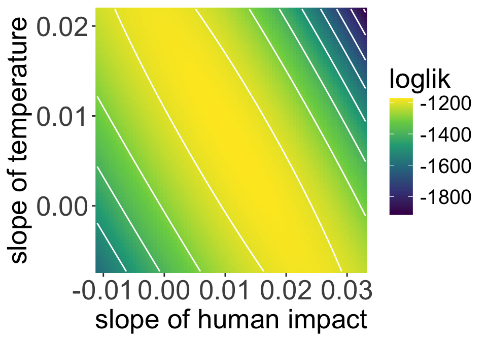 This is the likelihood surface for our model, visualizing just the coefficients for human impact and temperature