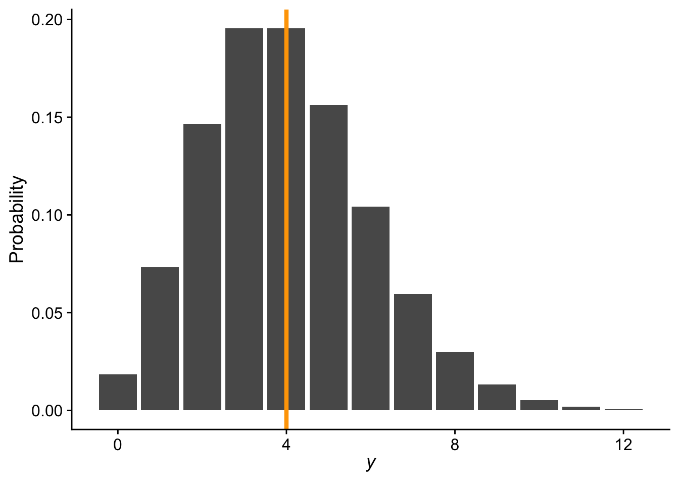 # range of count valuesnn <-0:12ggplot(data.frame(x = nn, y =dpois(nn, 4)), aes(x, y)) +geom_bar(stat ="identity") +xlab(expression(italic(y))) +ylab("Probability") +theme_cowplot() +geom_vline(xintercept =4, color ="orange", linewidth =1.5)
