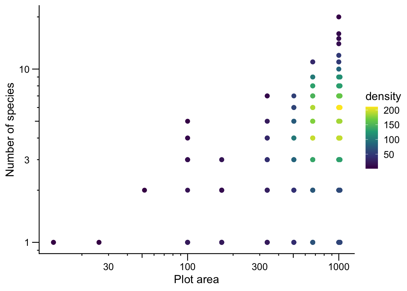 You’ll recall that in our R refresher we used the classic species area relationship (SAR) as an example for making data visualizations. To make a model of the SAR, a Poisson GLM might be an appropriate choice, after all number of species (the response variable in the SAR) is a count. One classic form for the (SAR) is expressed as