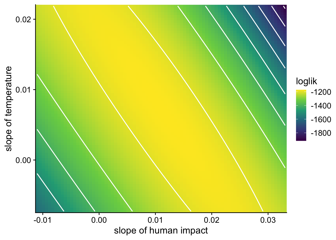 To see why, we can visualize the likelihood surface for the slopes of human impact and temperature from the model above:
