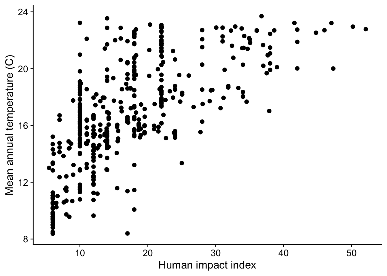 When we visualize human impact and temperature we see they are indeed correlated with each other: