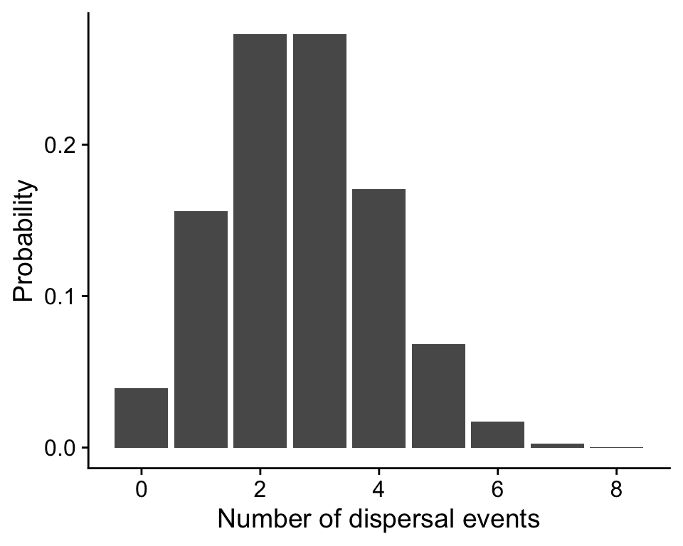 The height of the bars is the probability of observing that many dispersal events. The fact that the heights corresponds to probability means this probability distribution is a probability mass function or PMF. A PMF applies to any random variable that takes on discrete values like integers (0, 1, 2, …).