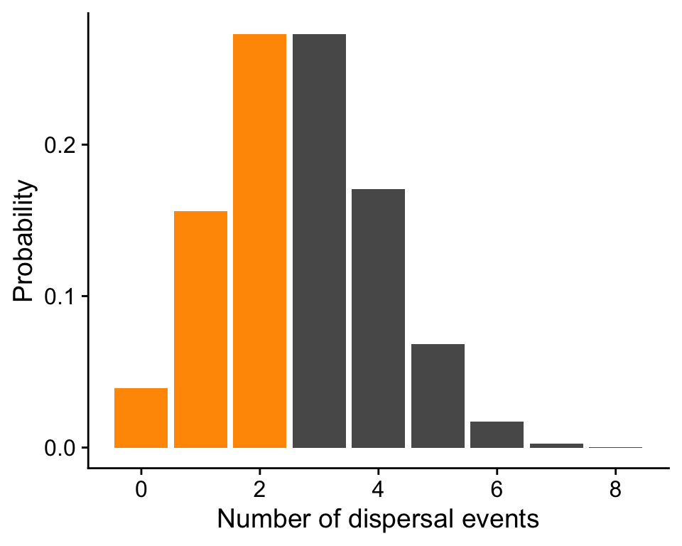 If we want to know about the probability of a range of values we can simply add the heights of the bars. For example the probability of observing 3 or few dispersal events is \(\mathbb{P}(n = 0)\) + \(\mathbb{P}(n = 1)\) + \(\mathbb{P}(n = 2)\) = 0.039 + 0.156 + 0.273 = 0.468. The sum of all the bars is 1 because that’s a rule of probability: all probabilities sum to 1—something has to happen, even if that “something” is, e.g., 0 dispersal events.