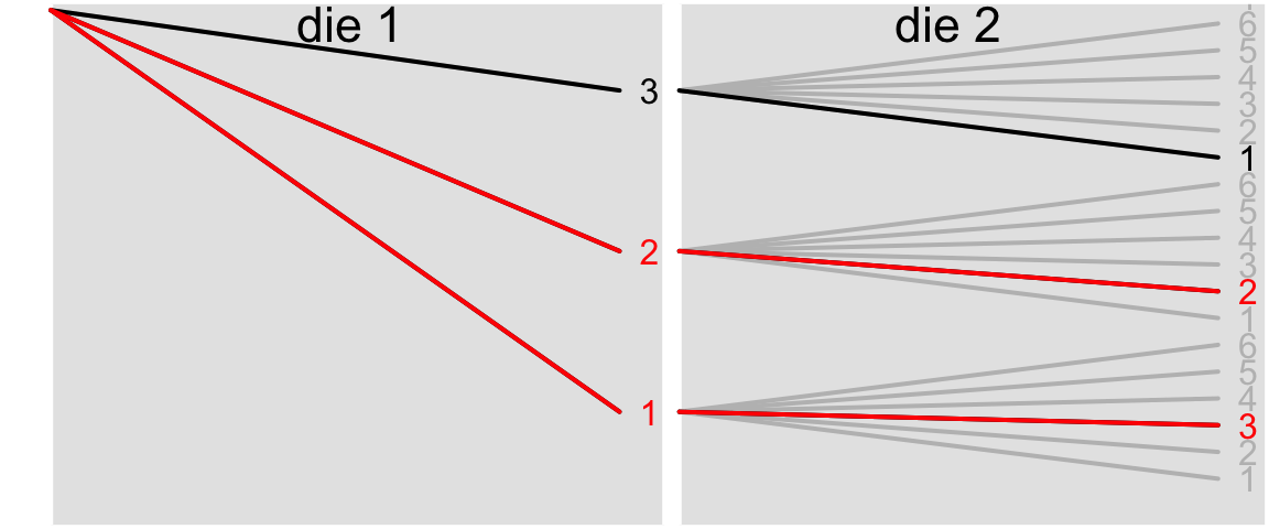but that is no longer correct. Why? Because I gave you additional information: speciation occurred. We are no longer counting up the ways to get a 1 or a 2 compared to all the possible outcomes for the first die, we have to condition on the fact that the sum of the two dice is 4. Thus we don’t want the straight probability \(\mathbb{P}(\text{1 OR 2})\), we want the conditional probability of rolling a 1 or 2 given the sum is 4: \(\mathbb{P}(\text{1 OR 2} \mid \text{sum} = 4)\). That mathematical expression is read “probability of 1 or 2 given sum equals 4.”
