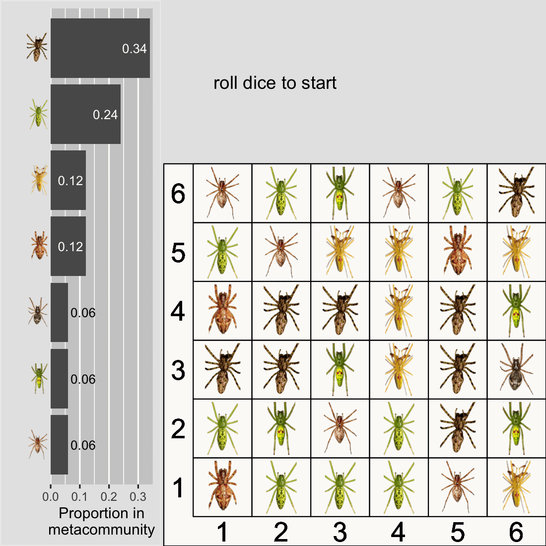 Now here is our challenge: let’s run the UNTB on this 6x6 grid using only two 6-sided dice and an assumption about the proportion of species in the metacommunity. Let’s also set \(m = \frac{1}{3}\) and \(\nu = \frac{1}{36}\). Think of it like a game. How can we play this game? Here are the rules: