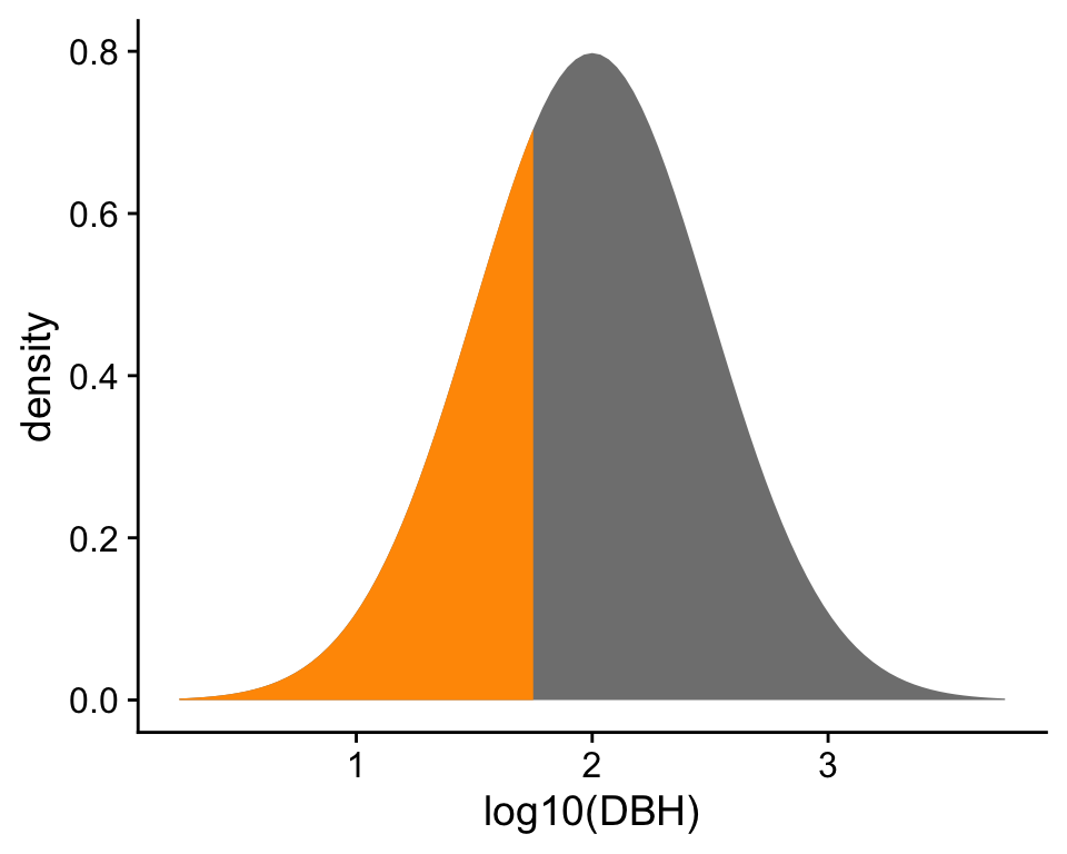 Probability density still gives us an impression of which values are more likely than others. To be precise, the area under the curve of a PDF over any region is indeed probability. For example, the probability \(\mathbb{P}(\log_{10}\text{DBH} \leq 1.75) = 0.309\).