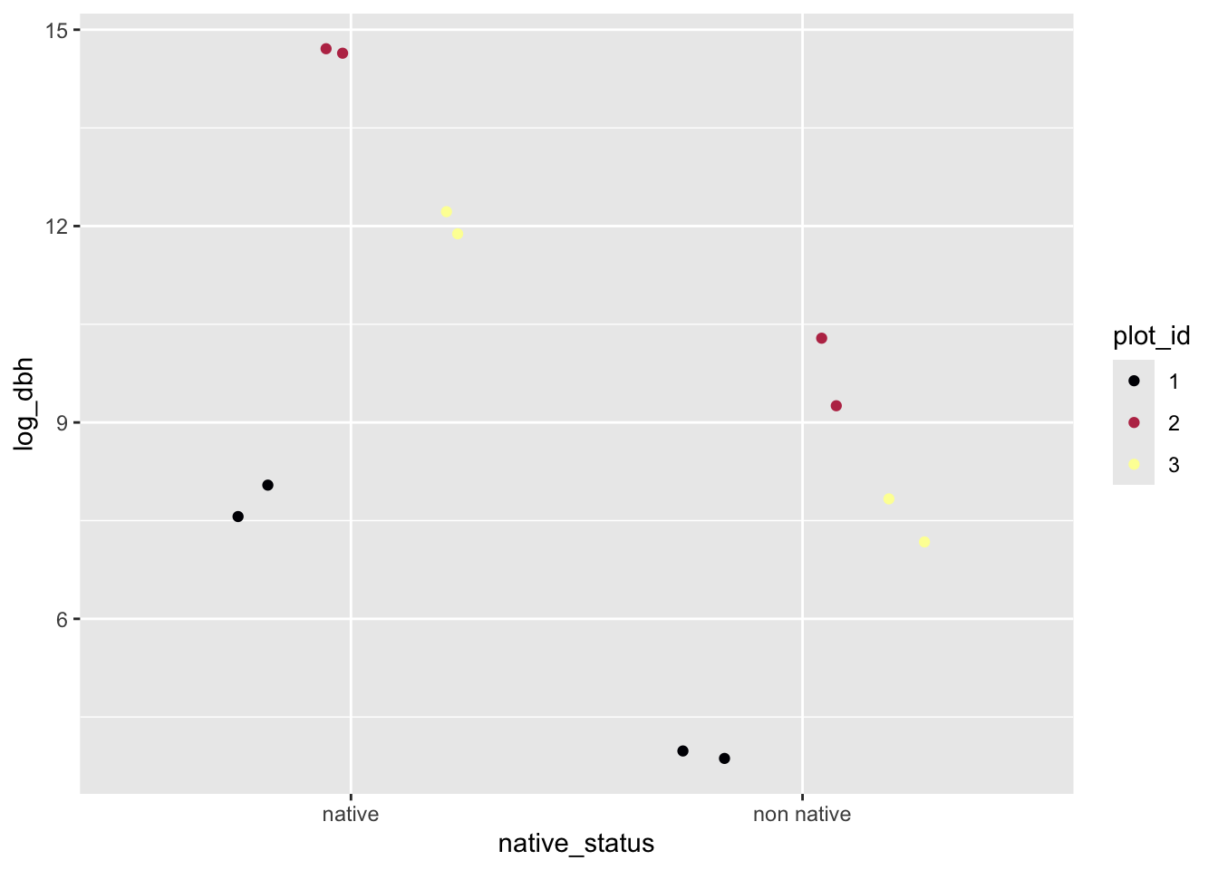 lm(log_dbh ~ native_status + plot_ID, data = dat)That would (maybe) be valid, but is it the best approach? I would say a random effect for plot is the better option, but why? It comes back to what our question really is. Our question is about the difference between native and non native trees. The unique ID of each plot does not make an appearance in that question. The facts that plots might be different and trees within plot are pseudo replicates are nuances of the analysis, but they are not the main story. However, to get the main story correct (or at least more correct) we need to account for those nuances. Thus we treat plot as a random effect.