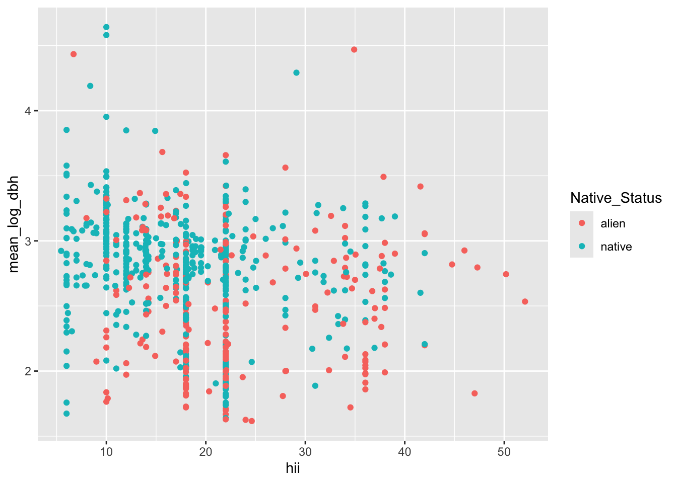 ggplot(dat_plot, aes(hii, mean_log_dbh, color = Native_Status)) +