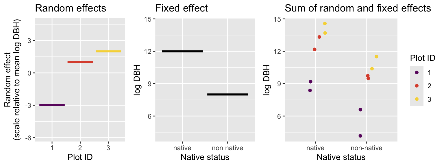 Random effects are one strategy for trying to deal with pseudo replication while still leveraging all the data (e.g. not reducing multiple observations to a single mean value). A model with both fixed effects and random effects is called a mixed effects model. Fixed effects are exactly what we’ve already been working with: the slope of log DBH changing across human impact, the difference between native and non-native trees. Those are fixed effects because we are trying to estimate the one best value for those parameters—we maximize the likelihood function to find the one best maximum likelihood estimate for the slope and the one best maximum likelihood estimate for the difference between means of native and non-native trees.
